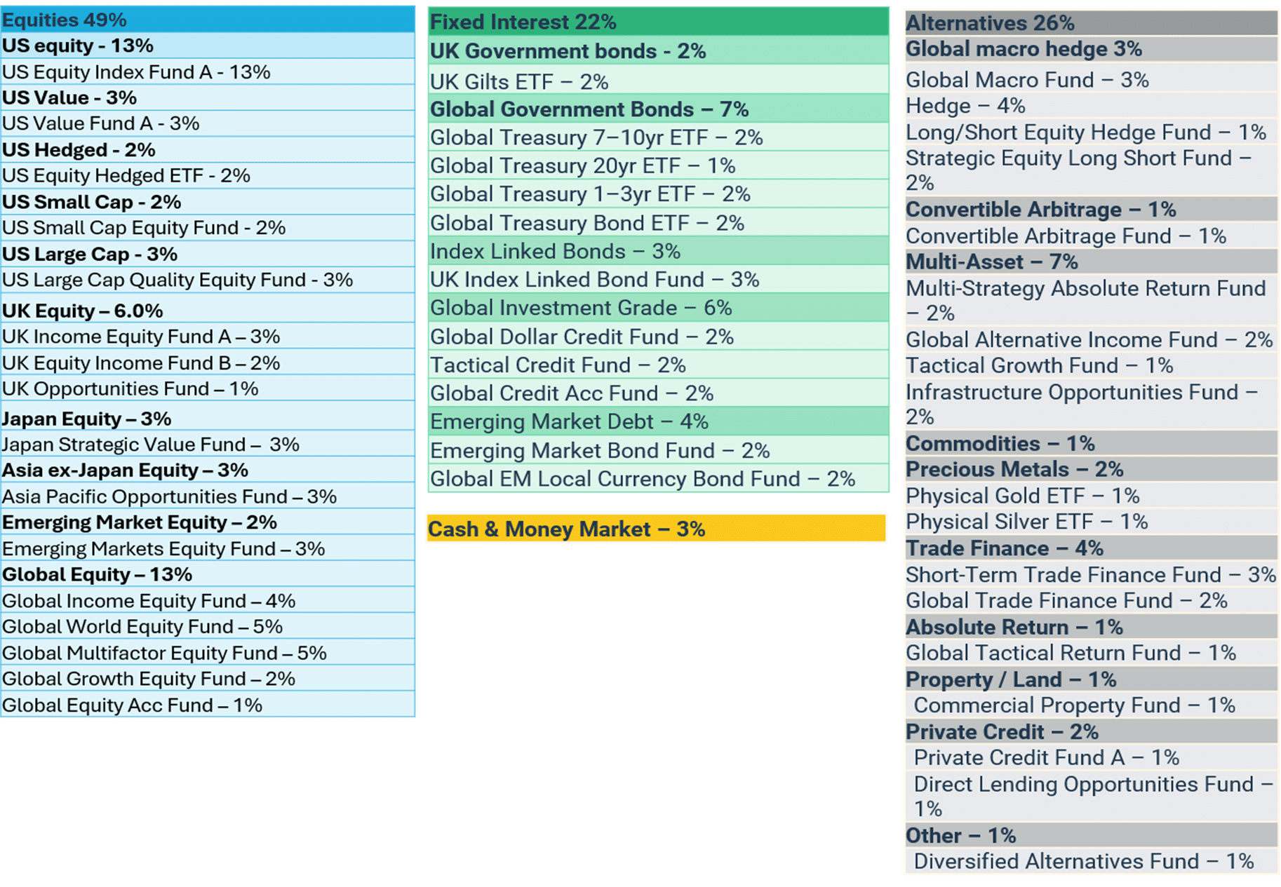 In-specie transfers take significantly longer than cash transfers because every individual holding must be moved separately. An in-specie transfer may take around three to five months, although the timeframe can be shorter or longer depending on various factors including individual circumstances and whether securities have already been set up. This is because a typical diversified portfolio, like the example of our Saltus Multi Asset Class portfolio shown below, could contain dozens of funds across multiple asset classes. Each fund has to be contacted in turn, with instructions processed by different fund houses, custodians and administrators, all working to their own timelines and operational procedures. It’s also worth noting the process for pensions stock transfers typically takes longer than ISAs or GIAs.